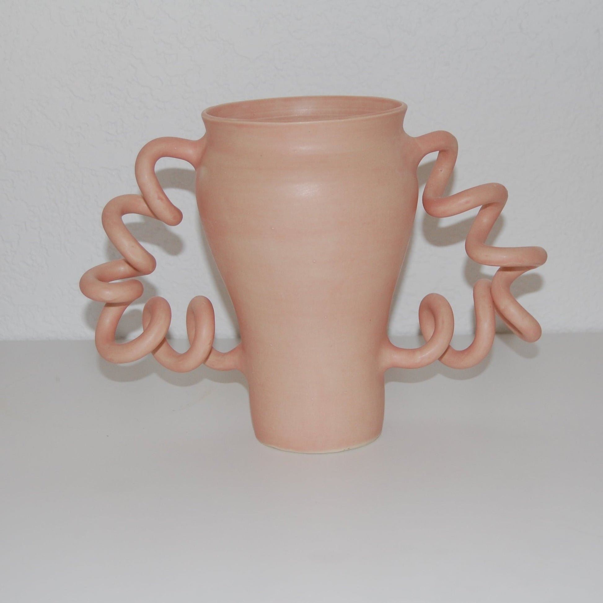 A wheel thrown, handmade sculpture, using white stoneware with contemporary coiled handles with a matte bubblegum pink.