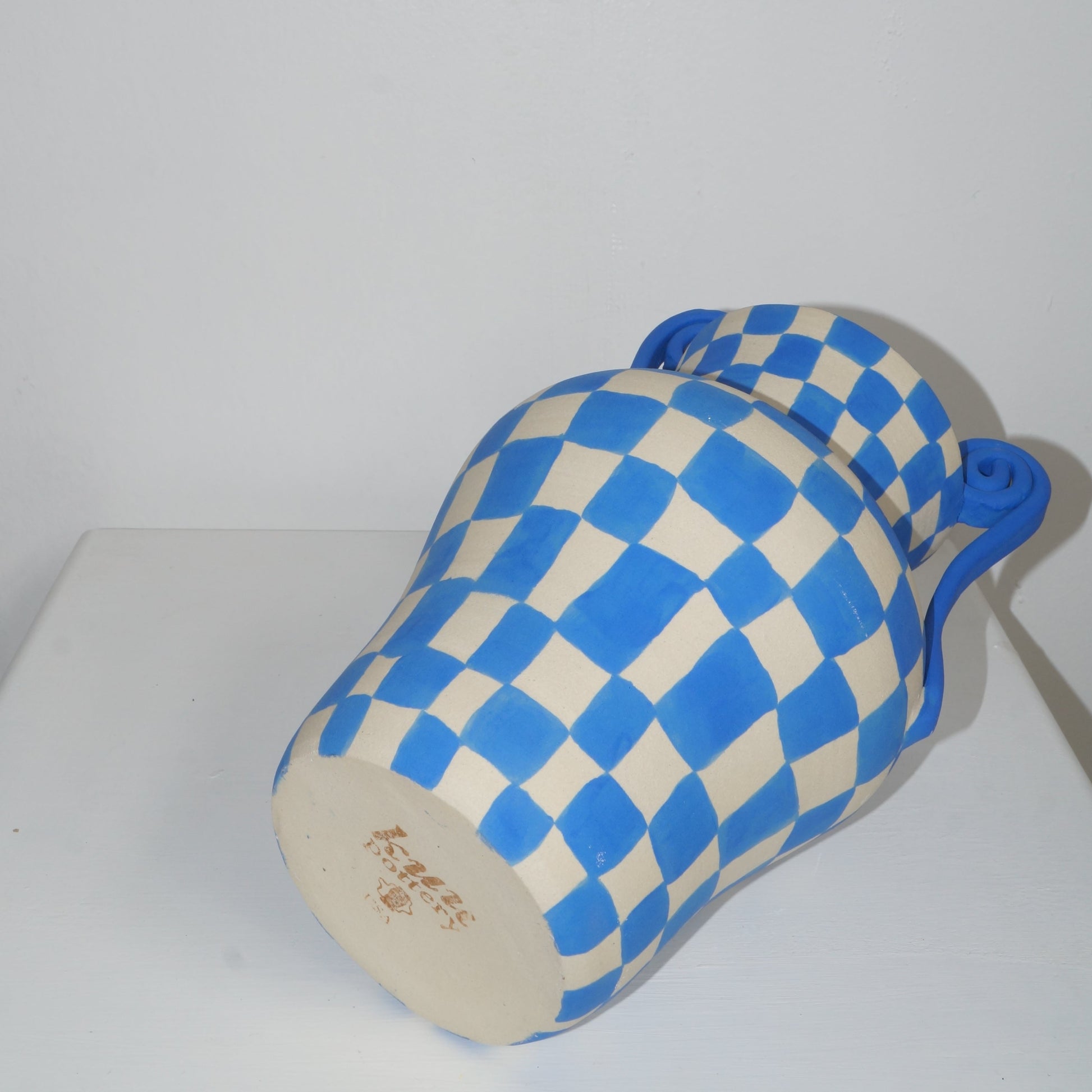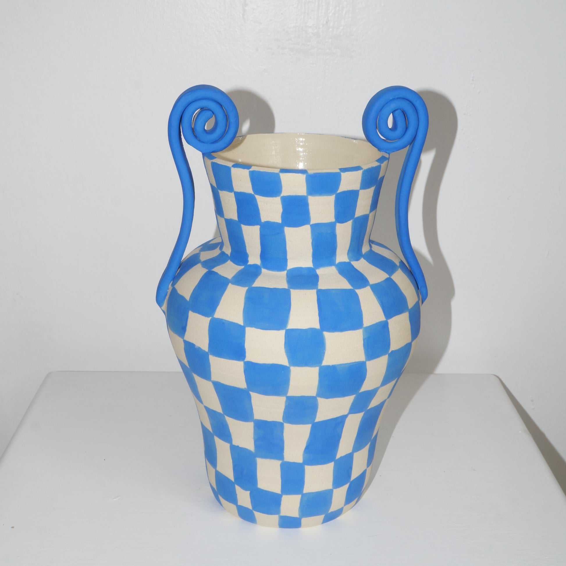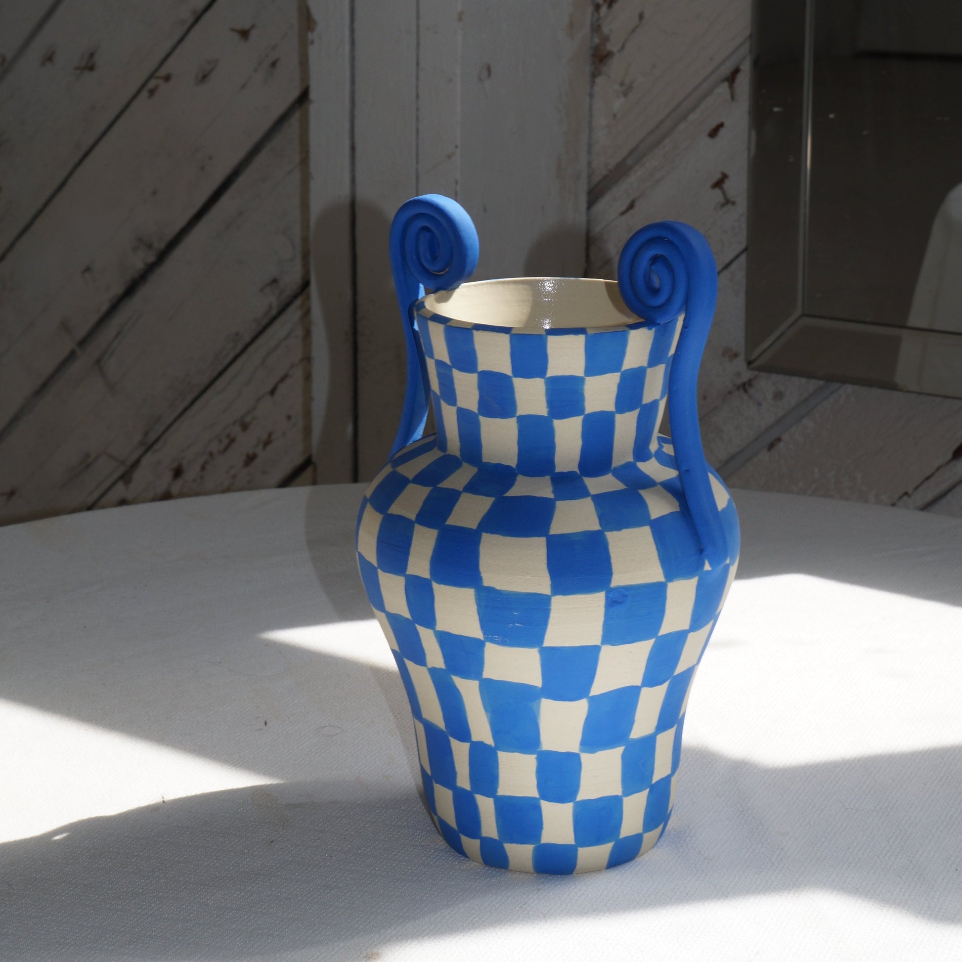 Each is the only one of its kind and features hand-painted checkers subtly seen in the brown vase while the blue vase gives a pop of color and joy.
