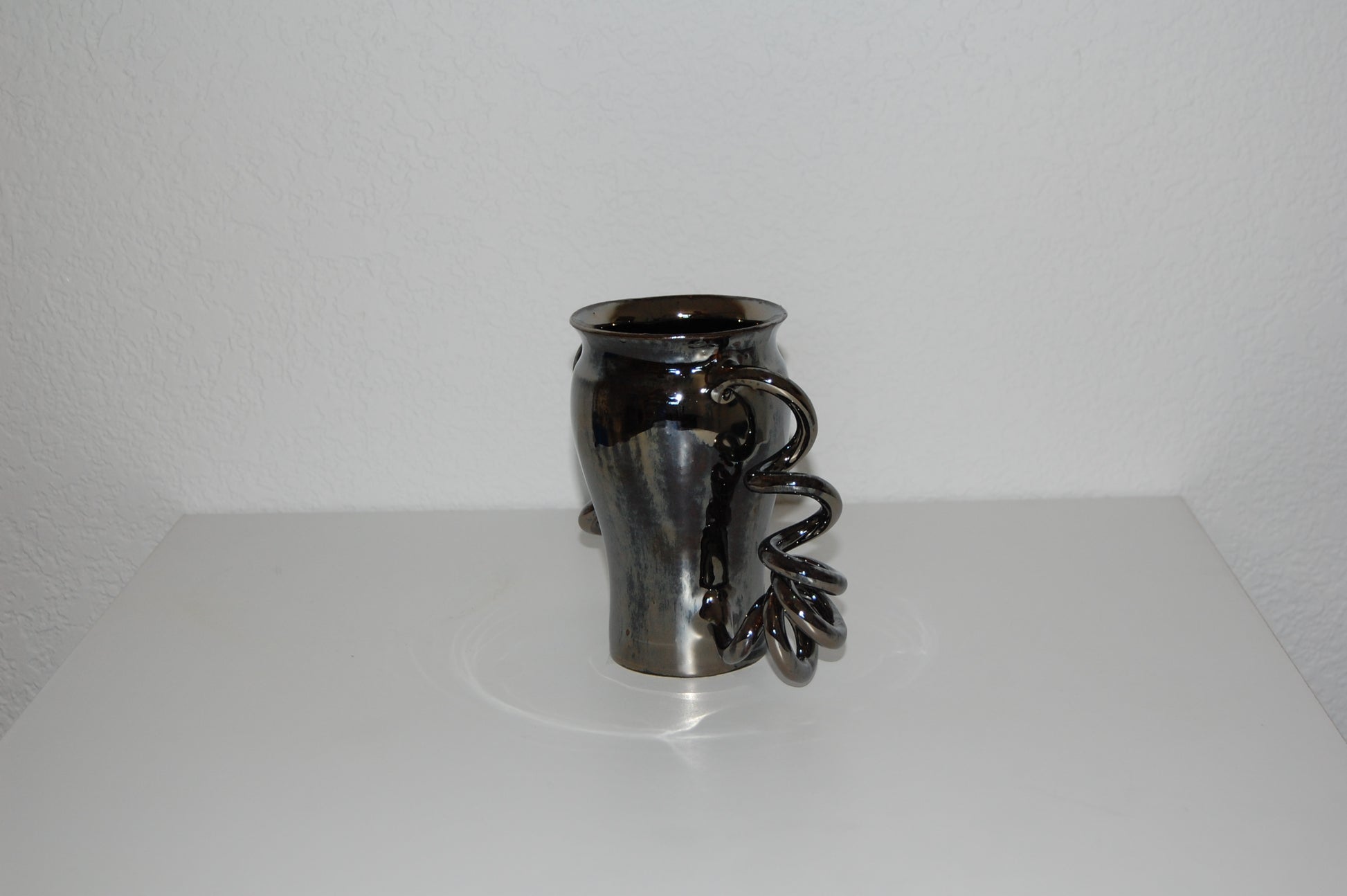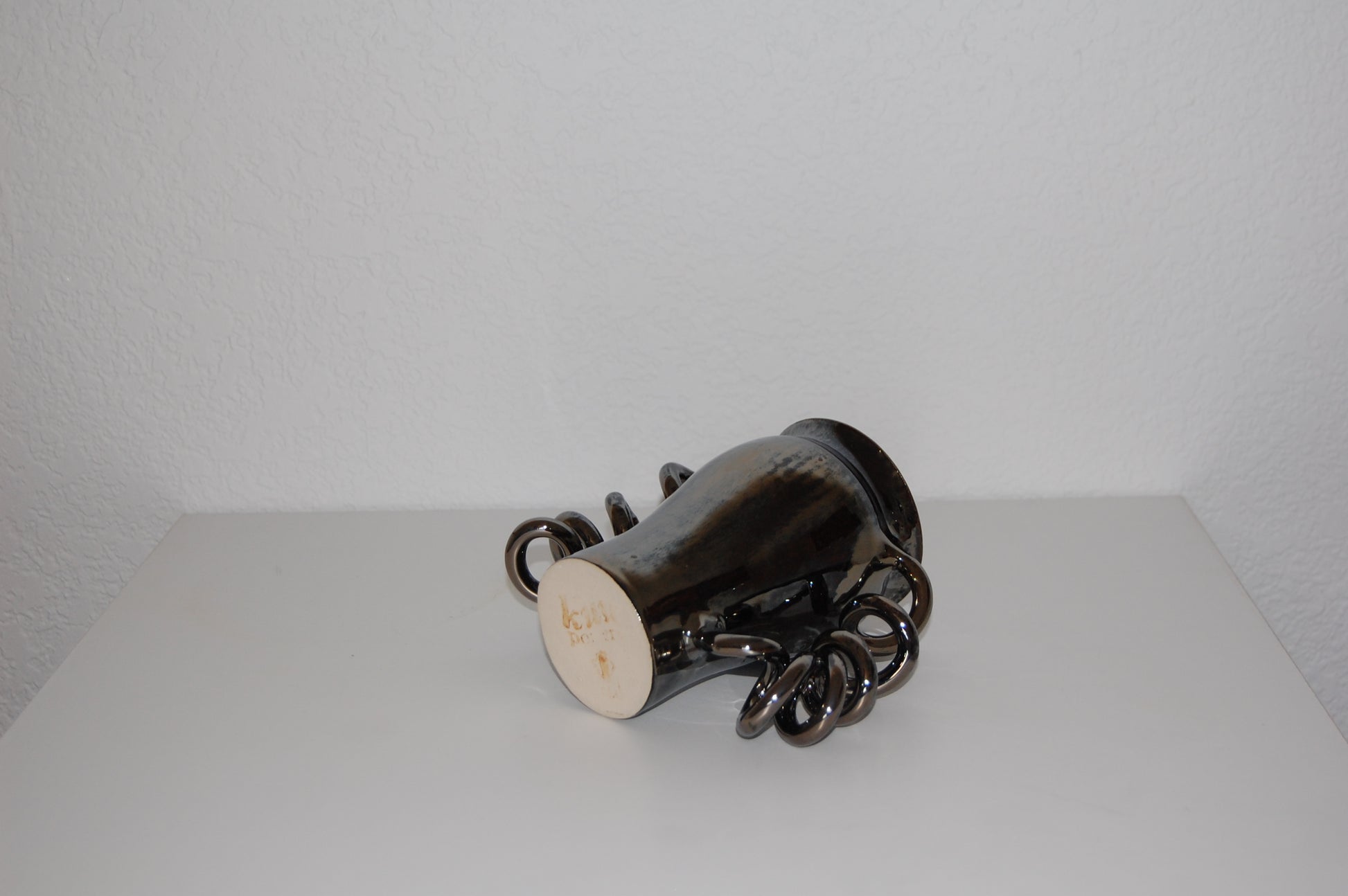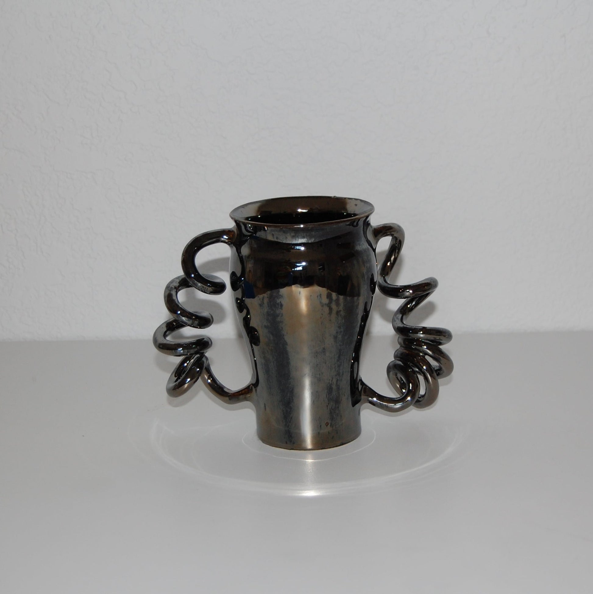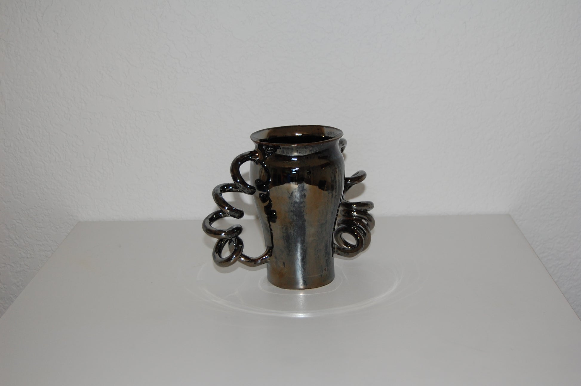 A wheel thrown, handmade sculpture using locally sourced white stoneware clay, with coiled handles and chrome reflective glaze.
