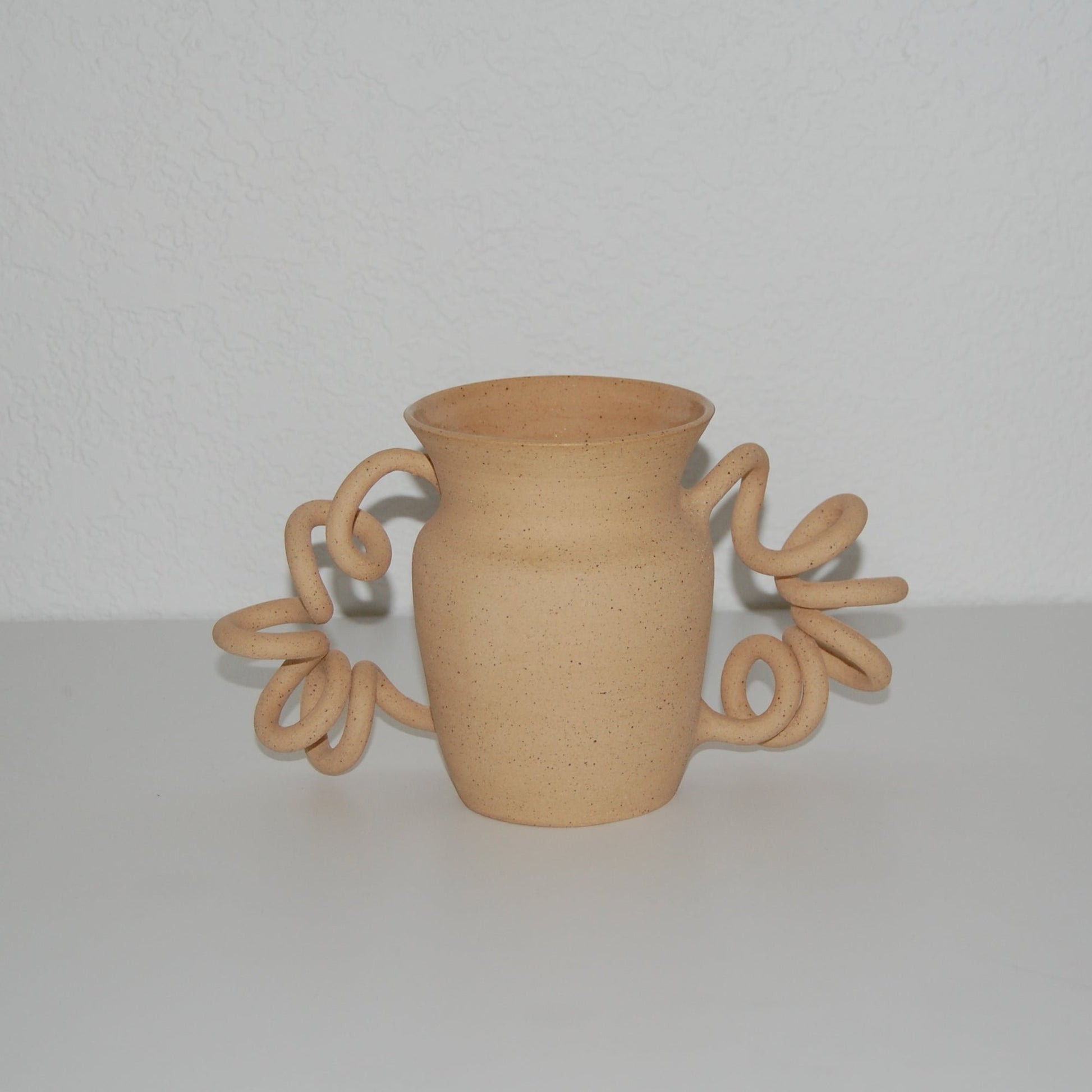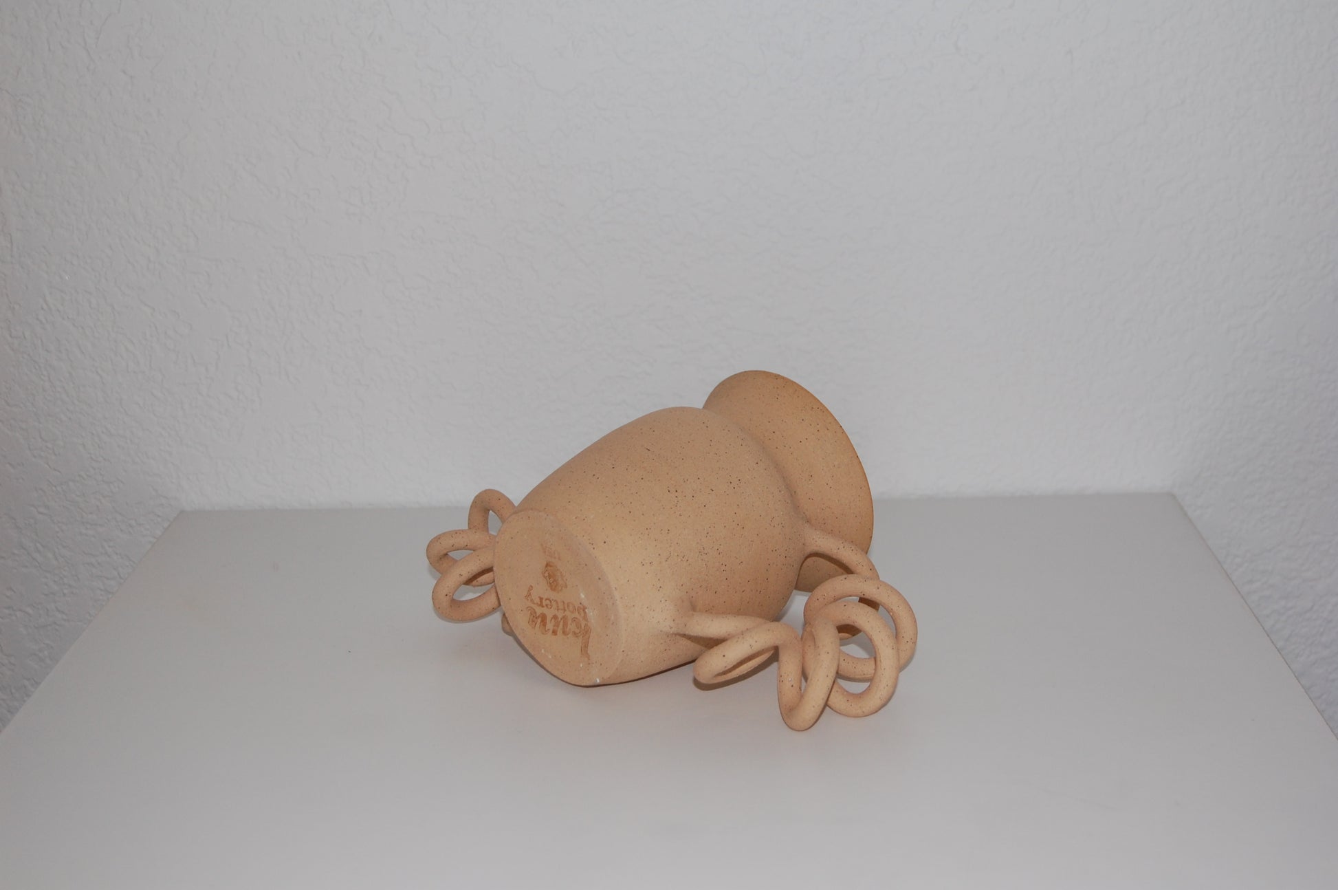 A wheel thrown, handmade sculpture using locally sourced white stoneware clay, with coiled handles and painted polka dot pattern using a dark brown matte glaze.