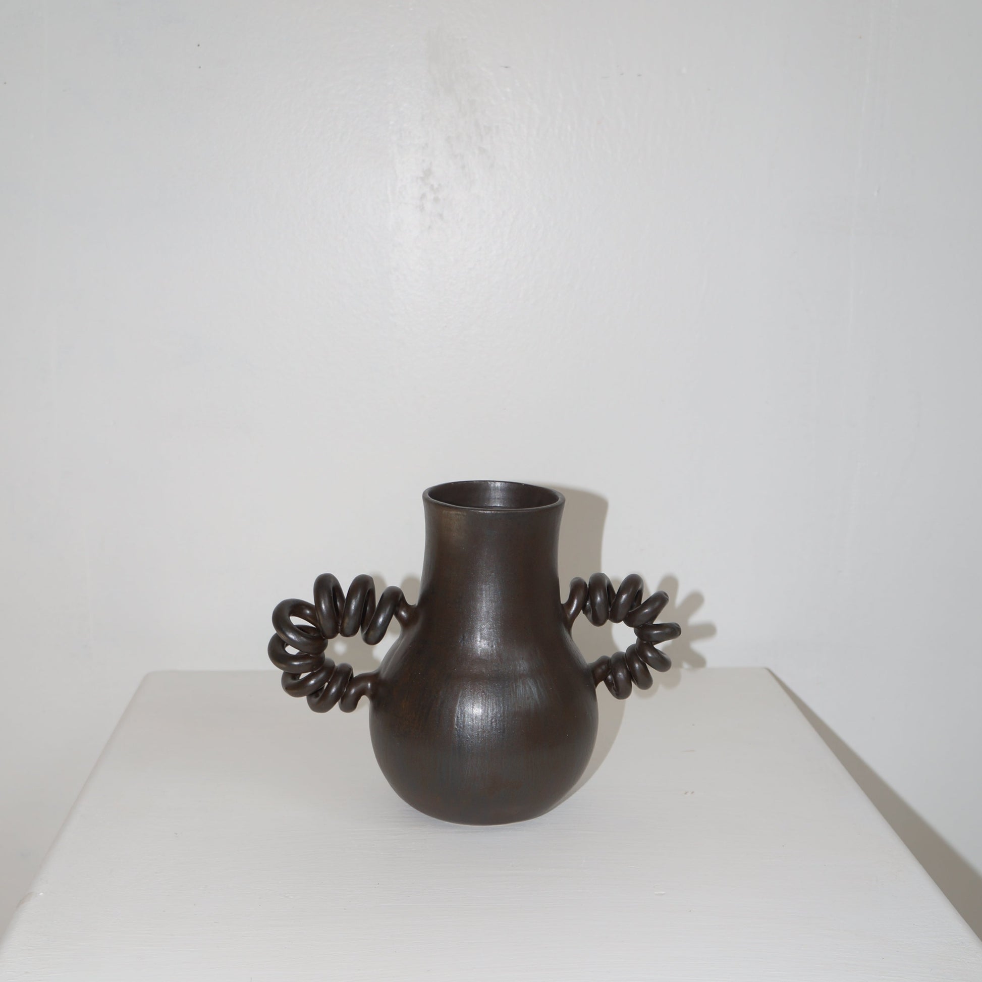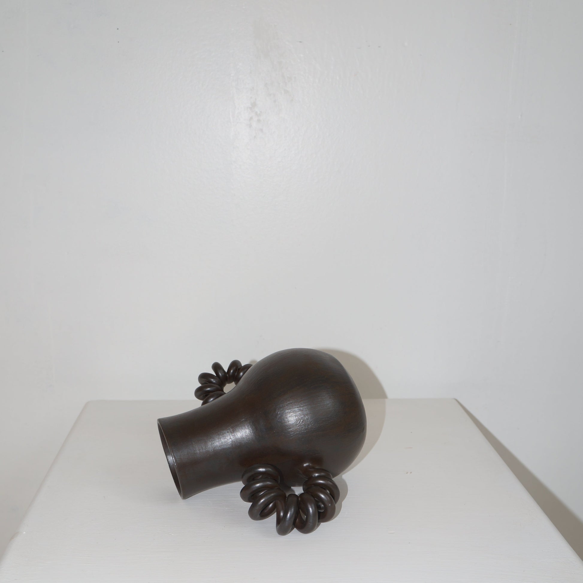 A wheel thrown, handmade sculpture using locally sourced white stoneware clay, with coiled handles and painted polka dot pattern using a dark brown matte glaze.