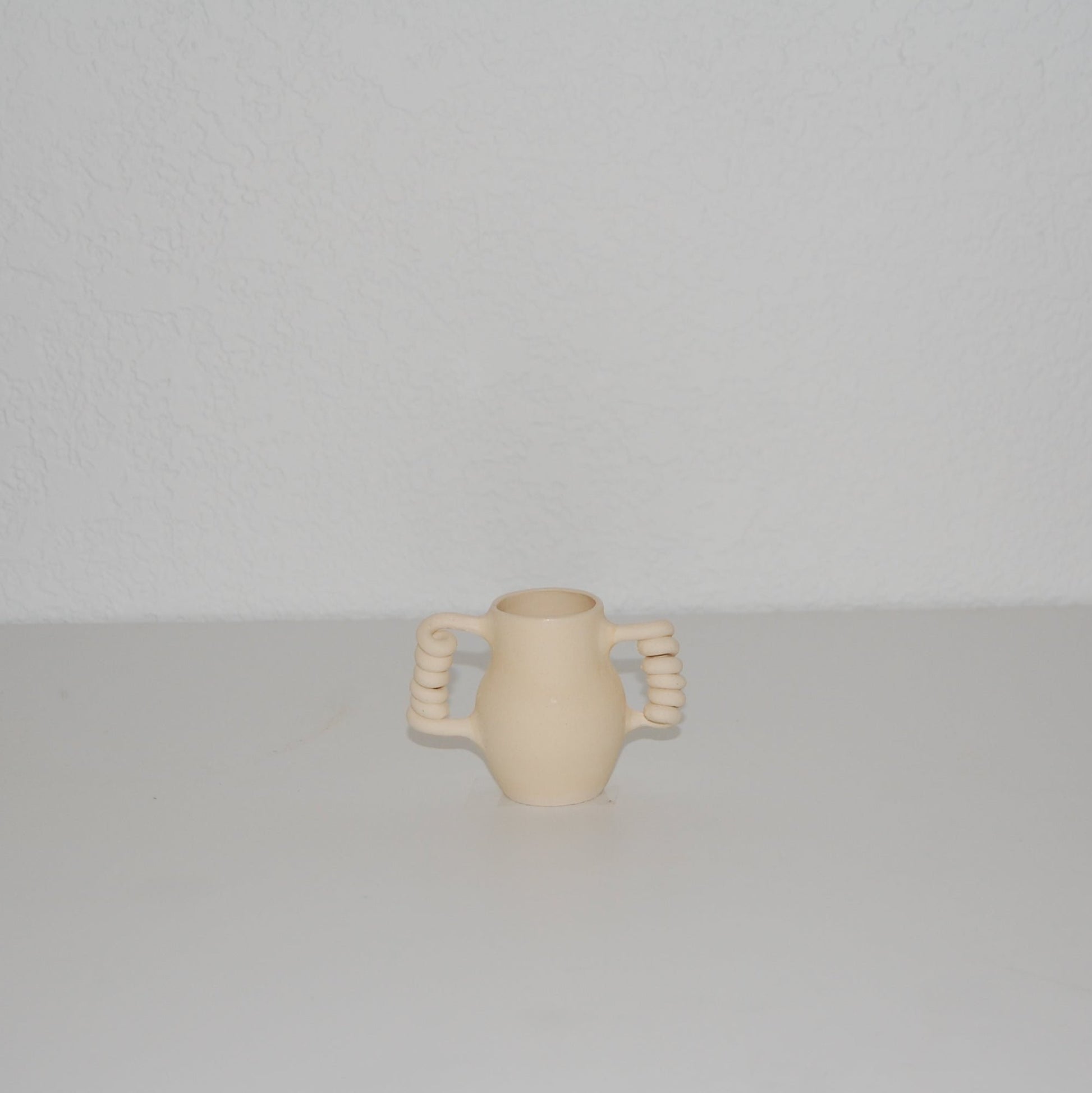 A wheel thrown, handmade sculpture, using white stoneware with contemporary coiled handles in a platinum chrome finish.