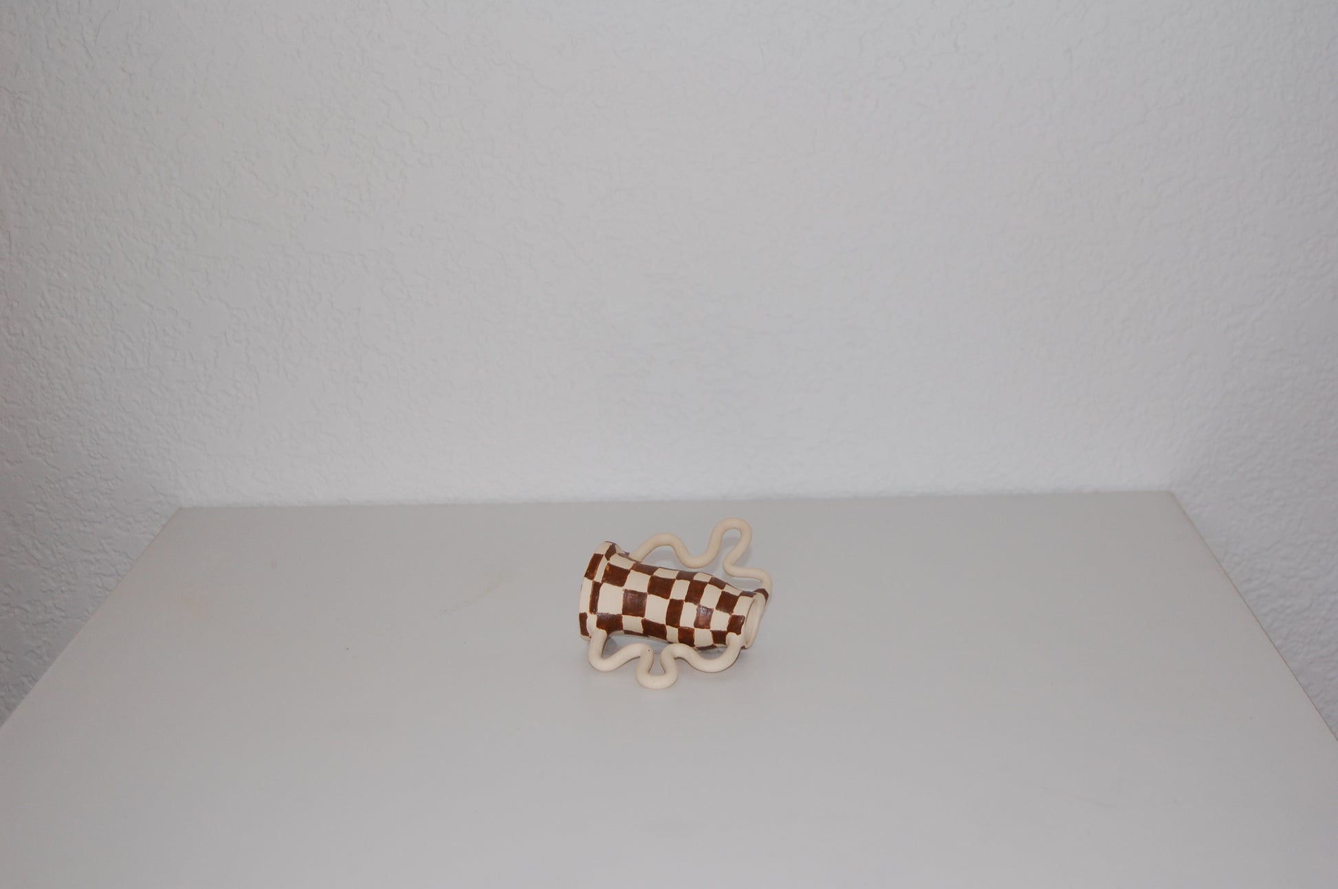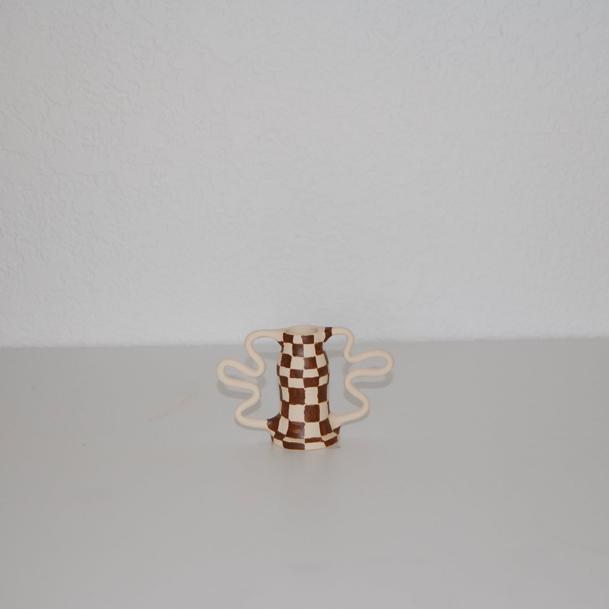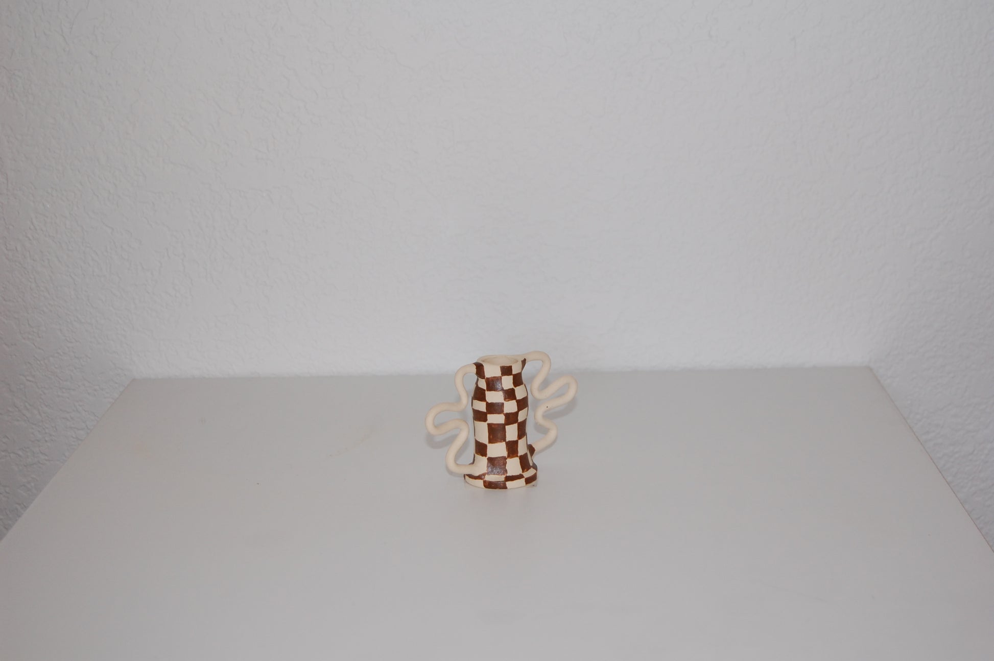 A wheel thrown, handmade sculpture, using white stoneware with contemporary coiled handles in a platinum chrome finish.
