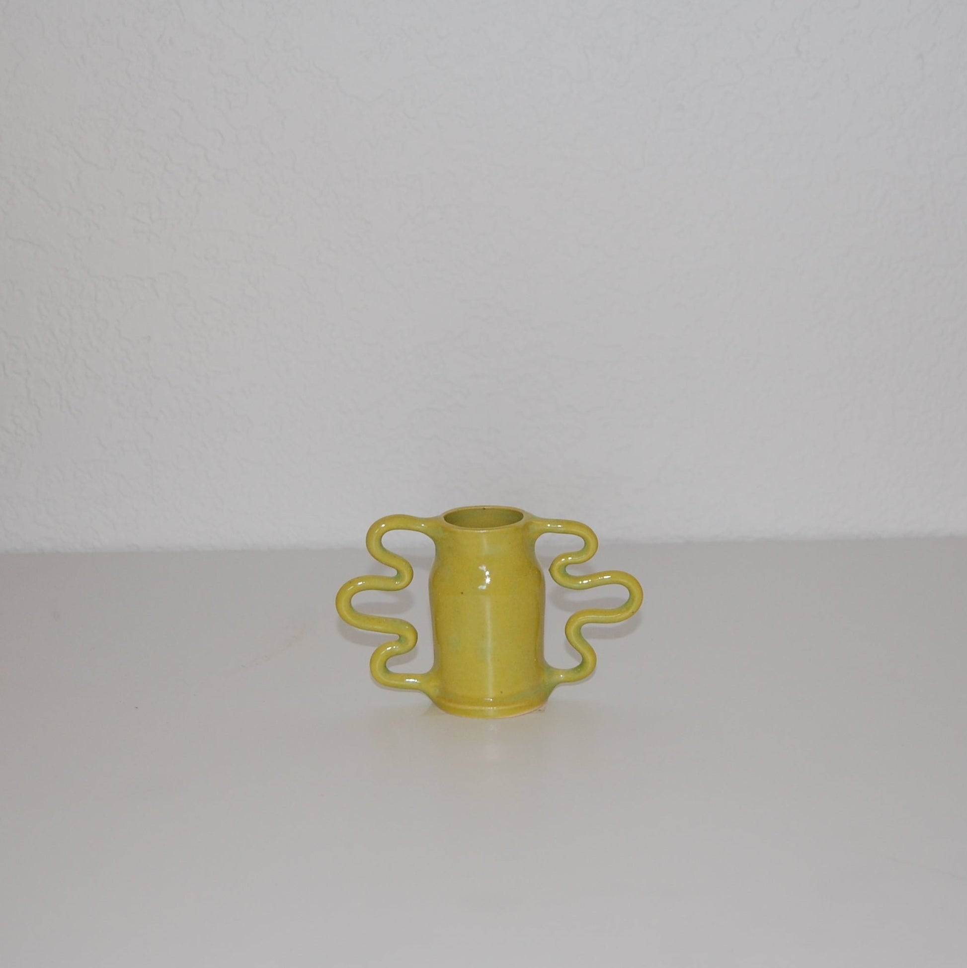 A wheel thrown, handmade sculpture using locally sourced white stoneware clay, with coiled handles and painted in a chartreuse glaze.