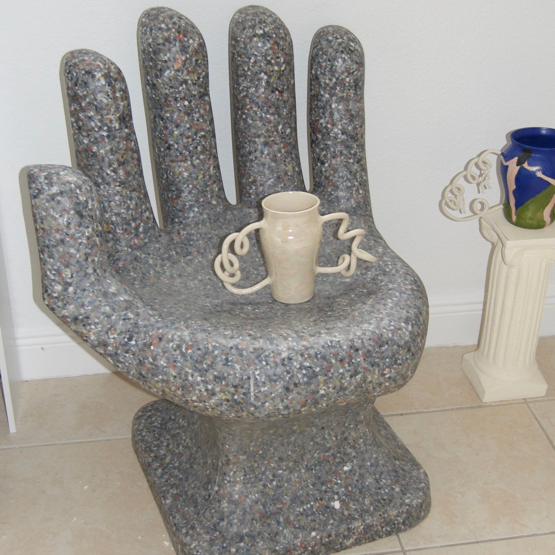 A wheel thrown, handmade sculpture, using spotted white stoneware with contemporary coiled handles in glossy pearl.